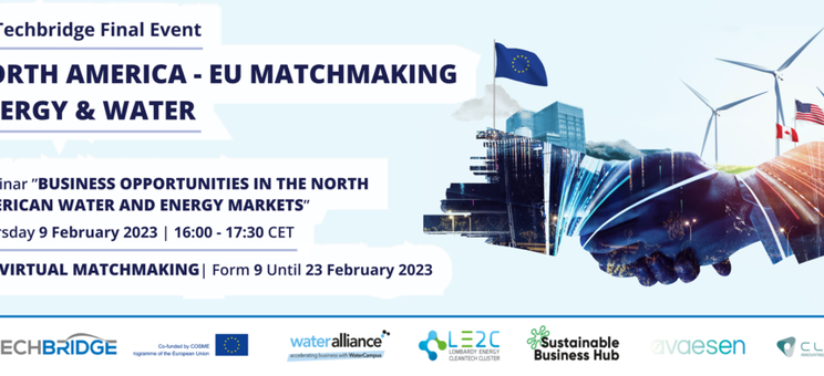 W ramach wydarzenia 'EU Techbridge Final Event: North America - EU matchmaking energy & water' odbędzie się webinarium (9 lutego) na temat możliwości podjęcia współpracy z partnerami z rynku Ameryki Północnej w zakresie rozwoju działalności w sektorze zielonych i niebieskich technologii, oraz spotkania b2b (10-23 lutego).