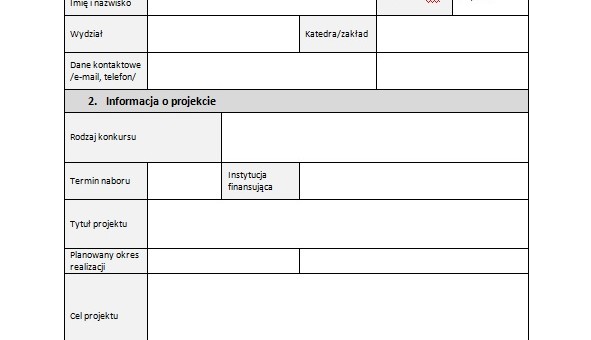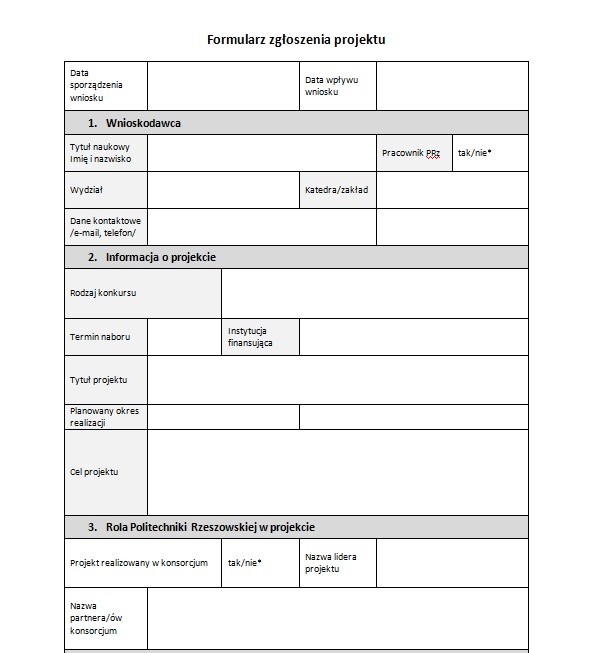 w celu usprawnienia procesu zgłaszania zamiaru przystąpienia do sporządzenia wniosków o dofinansowanie projektów w ramach różnych konkursów krajowych i międzynarodowych, Centrum Transferu Technologii opracowało jednolity formularz zgłaszania projektu. W związku z powyższym, w celu uzyskania akceptacji Prorektora ds. rozwoju i kontaktów z gospodarką na złożenie wniosku o dofinansowanie afiliowanego przez Politechnikę Rzeszowską prosimy o zgłaszanie projektów na załączonym formularzu. Formularz jest w wersji edytowalnej (.doc). Prosimy również, aby formularz był podpisany przez Dziekana danego Wydziału, z którego pochodzi Wnioskodawca.
