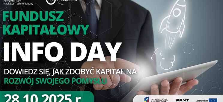 Zainteresowanych pomysłodawców zapraszamy również na Info Day Funduszu Kapitałowego PPNT, który odbędzie się 28 października 2025 (wtorek) w godzinach 10:00-11:30 w formie online. Podczas webinarium omówione zostaną szczegóły związane z aktualnym naborem innowacyjnych projektów. Będzie to także okazja do bliższego poznania Poznańskiego Parku Naukowo-Technologicznego jako potencjalnego inwestora.
