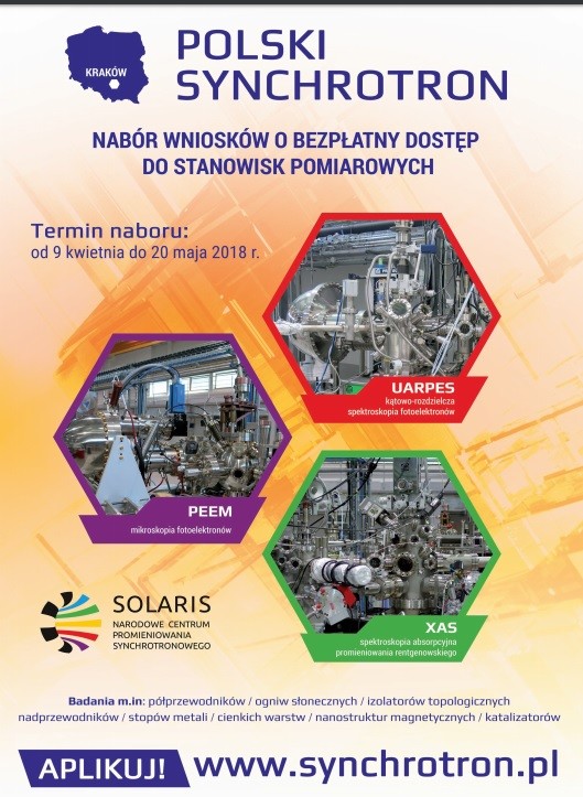 Informujemy, że 9 kwietnia br. otwarty zostanie nabór wniosków o bezpłatny dostęp do stanowisk pomiarowych polskiego synchrotronu.Synchrotron SOLARIS to najnowocześniejsze w kraju urządzenie umożliwiające prowadzenie badań różnego rodzaju materiałów. Unikalne właściwości promieniowania synchrotronowego sprawiają, że wiele pomiarów można przeprowadzić wyłącznie przy jego wykorzystaniu. Pozwala ono również zdobyć w krótszym czasie więcej lepszych jakościowo informacji niż przy użyciu tradycyjnych źródeł światła. Synchrotrony działają we wszystkich wysokorozwiniętych państwach. W Europie Środkowej synchrotron SOLARIS jest pierwszym i jedynym tego typu urządzeniem.