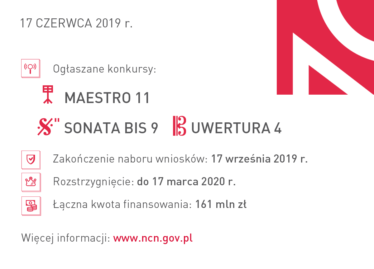 Szczegóły: https://www.ncn.gov.pl/aktualnosci/2019-06-17-ogloszenie-konkursow