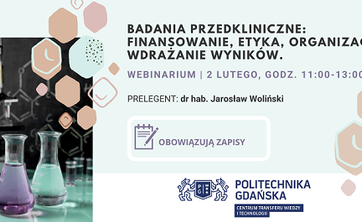 Centrum Transferu Wiedzy i Technologii Politechniki Gdańskiej zaprasza do udziału w bezpłatnym webinarium "BADANIA PRZEDKLINICZNE, FINANSOWANIE, ETYKA, ORGANIZACJA, WDRAŻANIE WYNIKÓW", które...