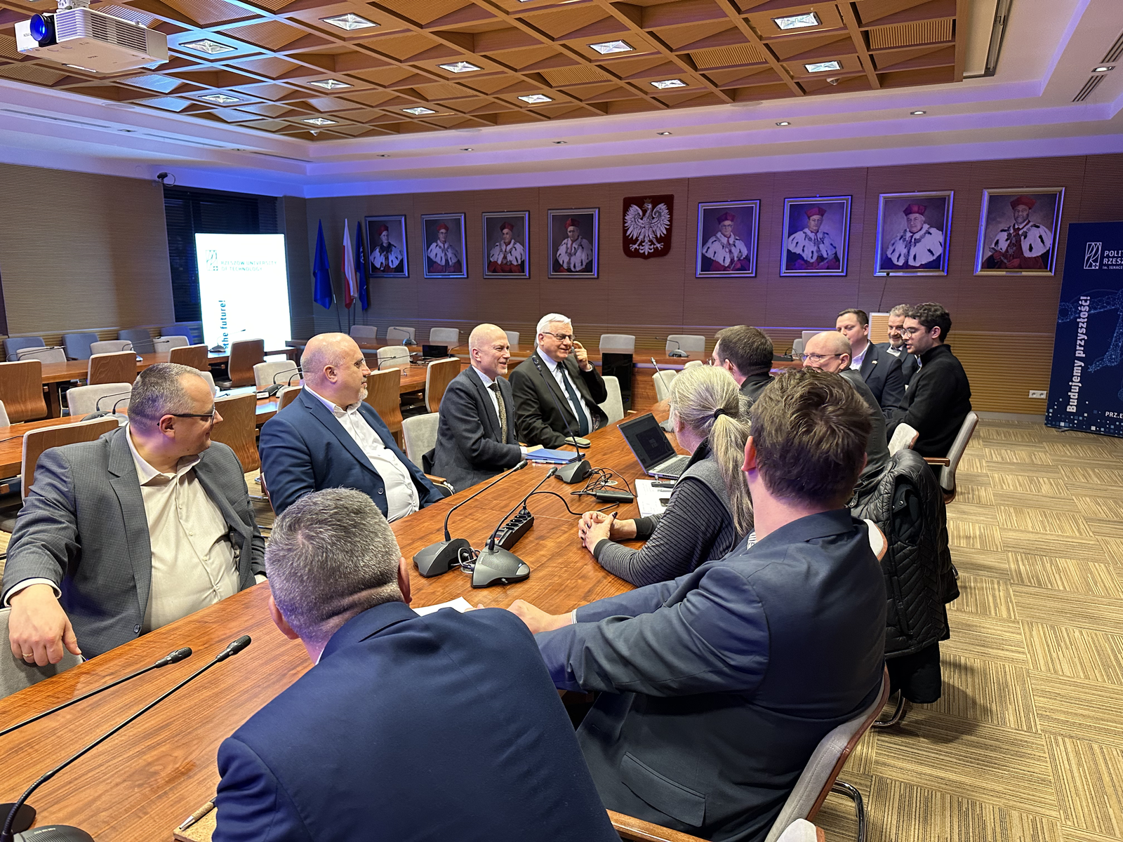 Zwieńczeniem wizyty było spotkanie w Sali Senatu Politechniki Rzeszowskiej z udziałem Prorektora ds. Rozwoju i Współpracy z Otoczeniem prof. dr hab. inż. Jarosława Sępa. W trakcie rozmów odbyła się wzajemna prezentacja potencjału obu instytucji.