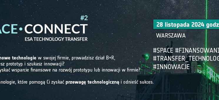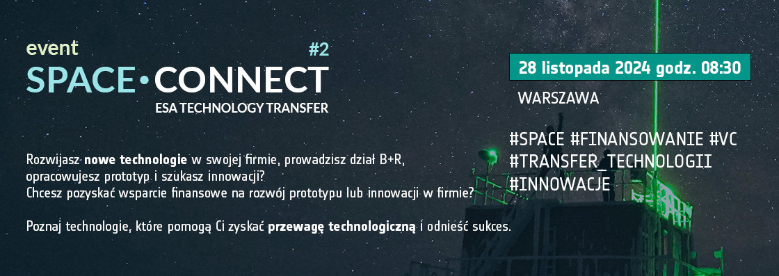 Serdecznie zapraszamy do udziału w wydarzeniu SPACE.CONNECT 2024: ESA Technology Transfer, które odbędzie się 28 listopada 2024 w Warszawie w godzinach 8.30-18.00 (Brain Embassy, Adgar Park West, 5 piętro, budynek B, Aleje Jerozolimskie 181, 02-222 Warszawa).